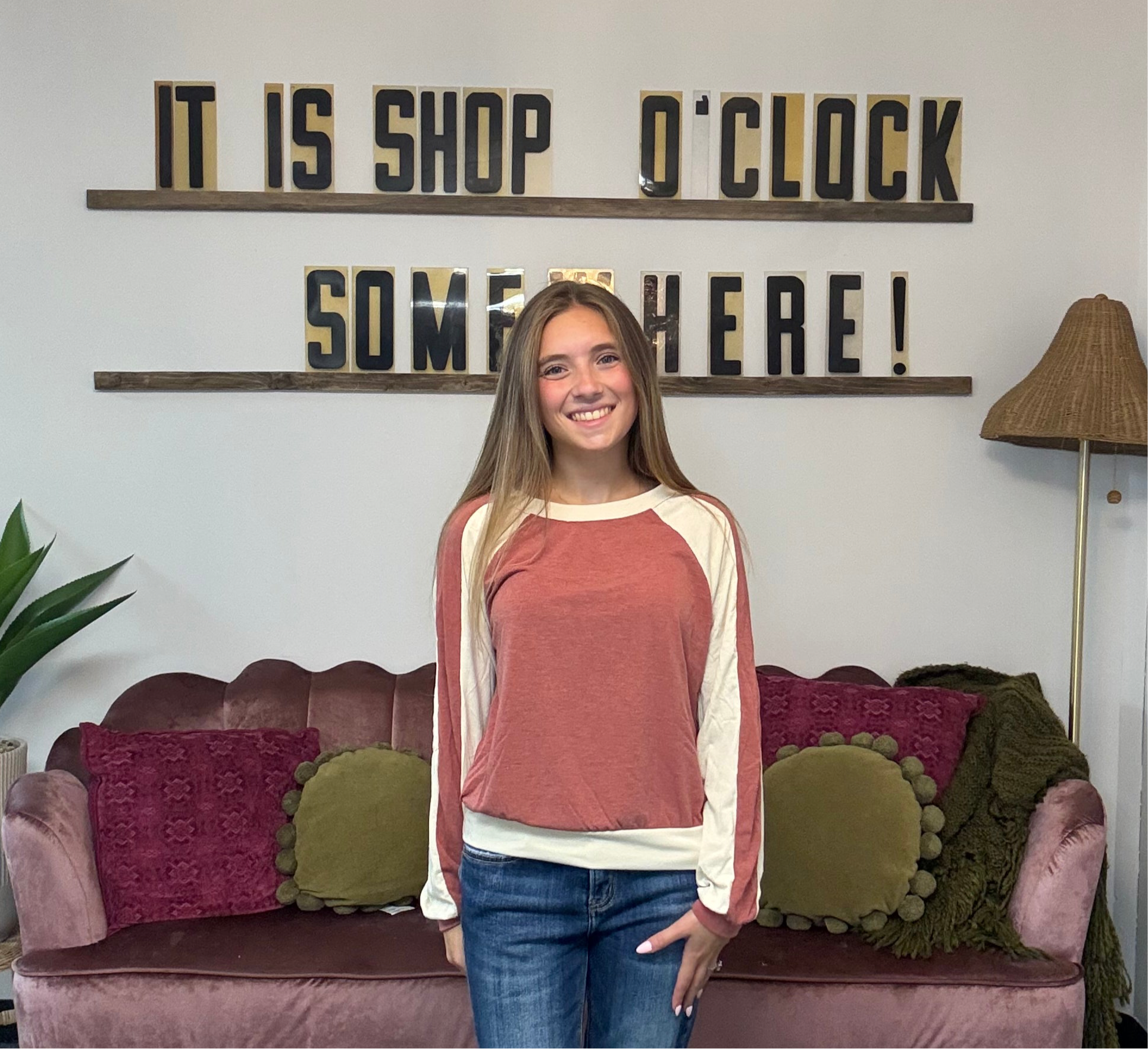 This top has a cozy, yet stylish feel with its contrasting colors of rust and cream. Perfect for chilly days or just lounging around. Fits true to size