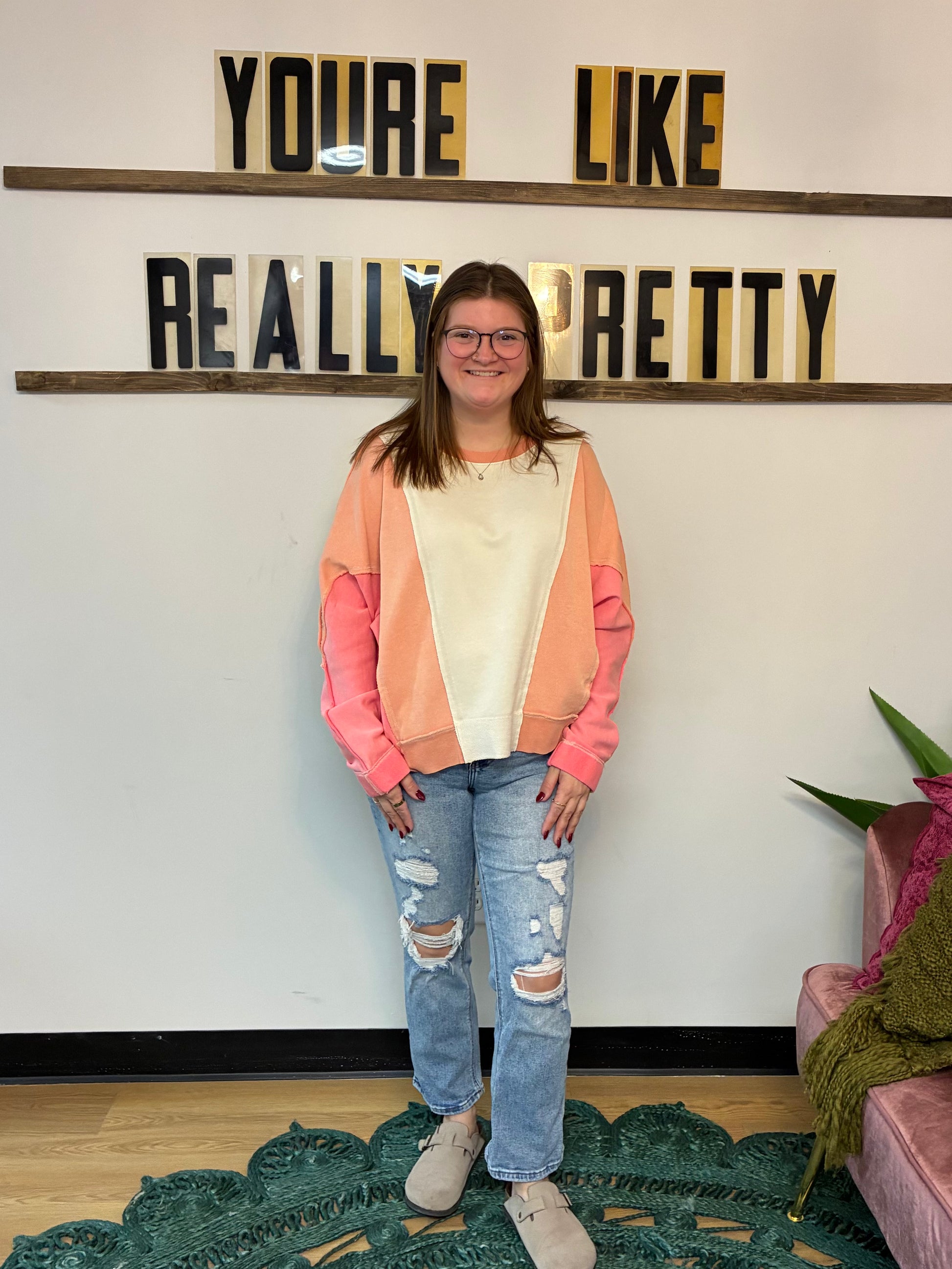 Mineral Wash Color Block Pullover - Coral