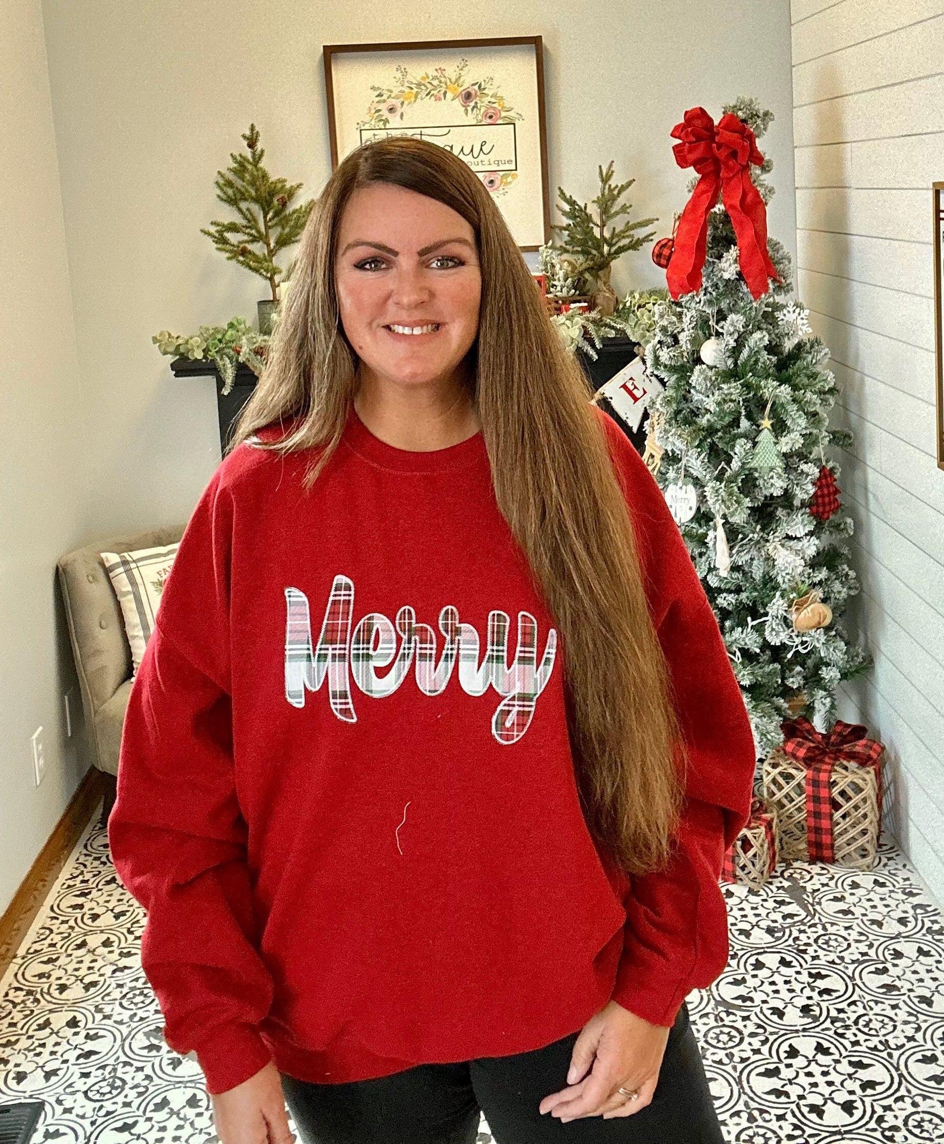 This is OH so cute! Appliquéd plaid letters on a cherry red crew. Fits true to size. Liz is wearing a 2X