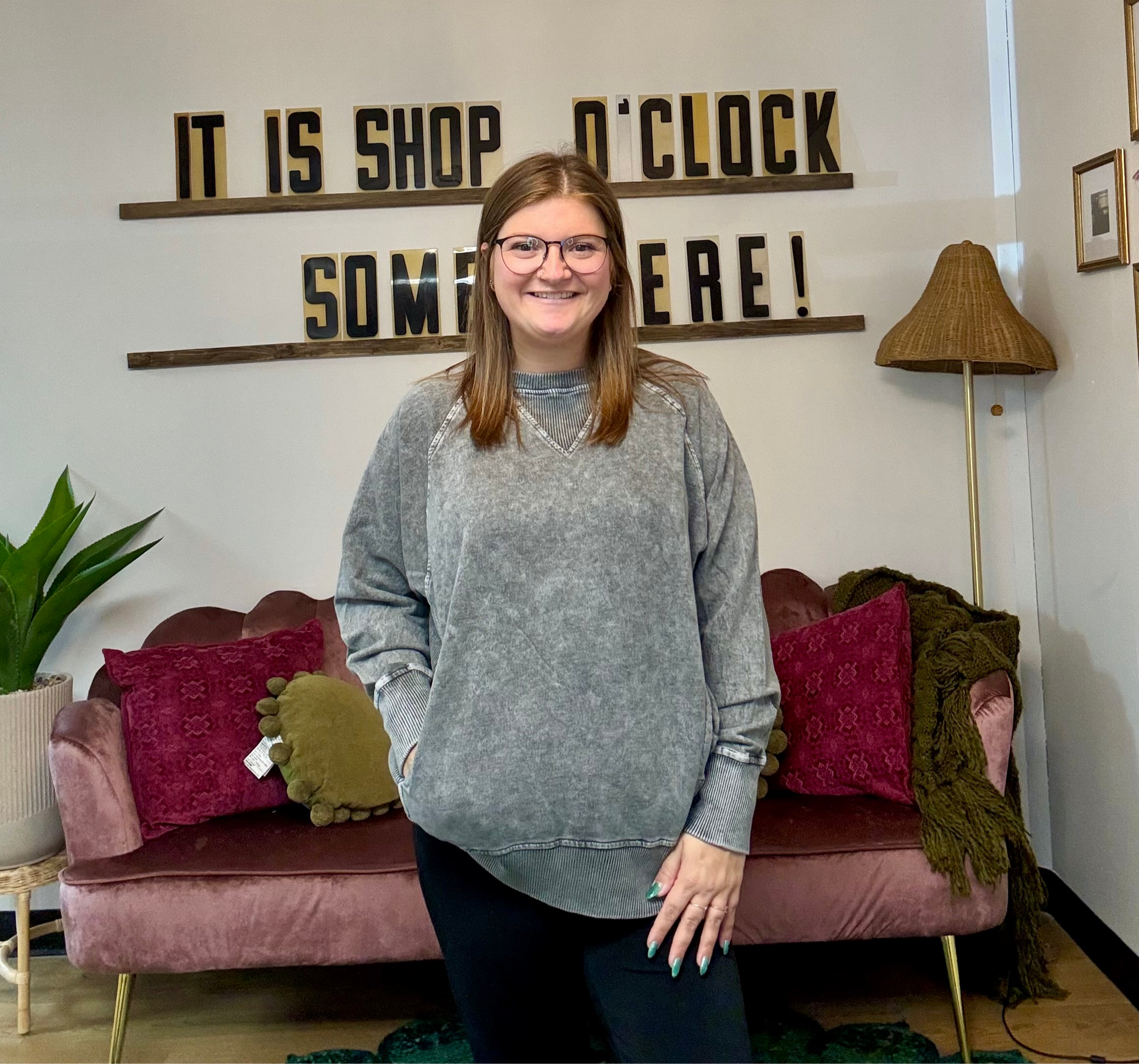 Pocketed Round Neck Pullover - Acid Wash Grey