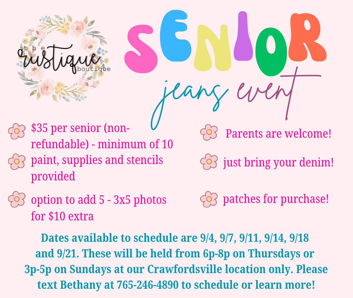 IF you want photos to put on the jeans, please select the drop-down and add that option prior to checking out. You will receive 5 - 3x5" pictures for an additional $10. If you want 10 photos, you will need to select that instead of the 5. Photos must be emailed to Bethany at info@shoptrb.us and must be sent a week prior to the scheduled event.
